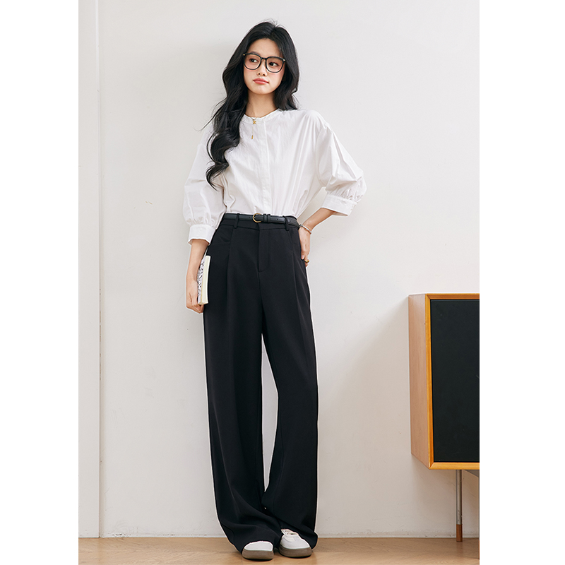 FAESSLIN 【Брюки с поясом А4】 Черные костюмные брюки с высокой талией, женские летние удлиненные тонкие широкие брюки из драпировки высокого класса.