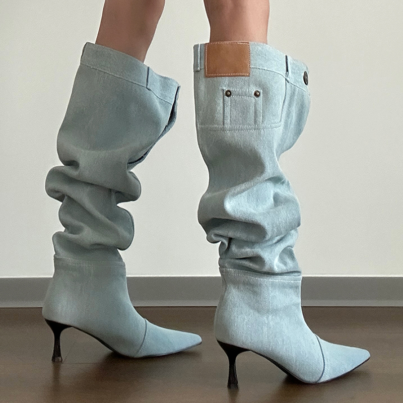 Коричневые ботинки средней длины с V-образным вырезом в стиле ретро; женская обувь; коллекция 2025 года; сезон весна-осень-зима; джинсовые высокие сапоги в западном стиле с острым носком