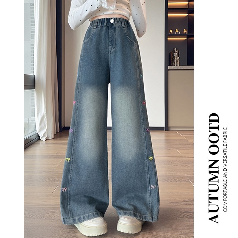 Купить Широкие джинсовые брюки для девочек в корейском стиле, осень 2025, новые детские штаны, осенняя одежда для учащихся младших классов средней школы, прямые брюки для больших девочек на таобао
