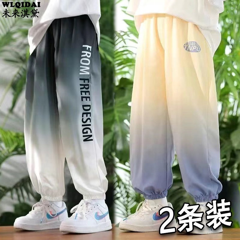 Быстросохнущие брюки для мальчиков, летние тонкие брюки, противомоскитные брюки из ледяного шелка для девочек, летняя одежда для больших детей, свободные брюки градиентного цвета