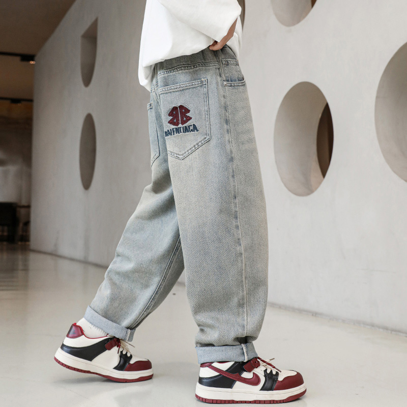 Купить Брюки для мальчиков, осенние светлые джинсы, новый стиль 2025 года, весенние и осенние свободные брюки для больших детей, детские повседневные брюки на таобао