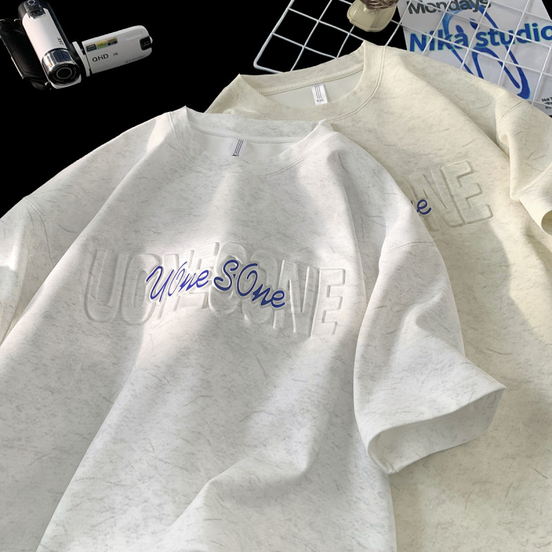 Купить Мужская футболка из плотного хлопка с короткими рукавами, промытая американским песком, лето 2025, новый стиль, стальной принт, свободный дизайн с короткими рукавами на таобао