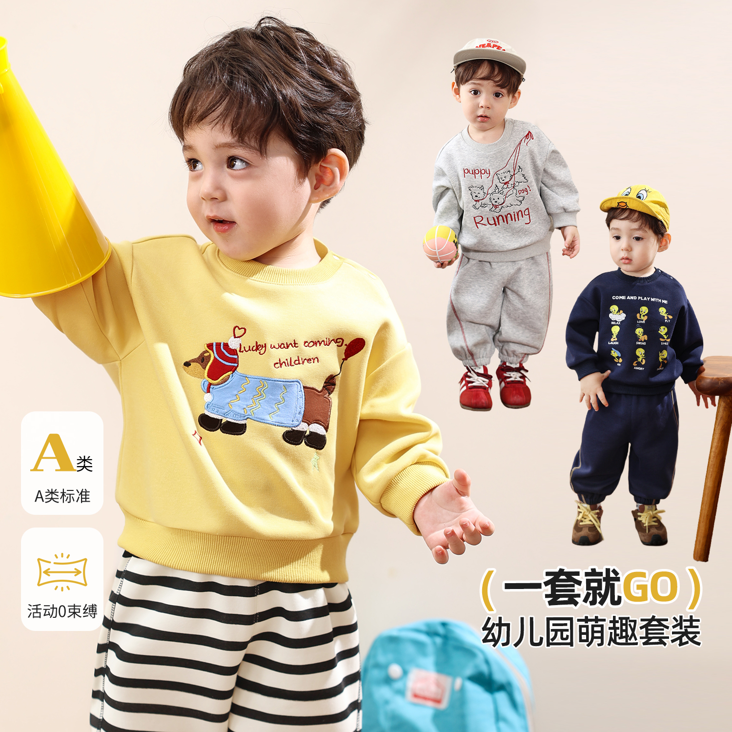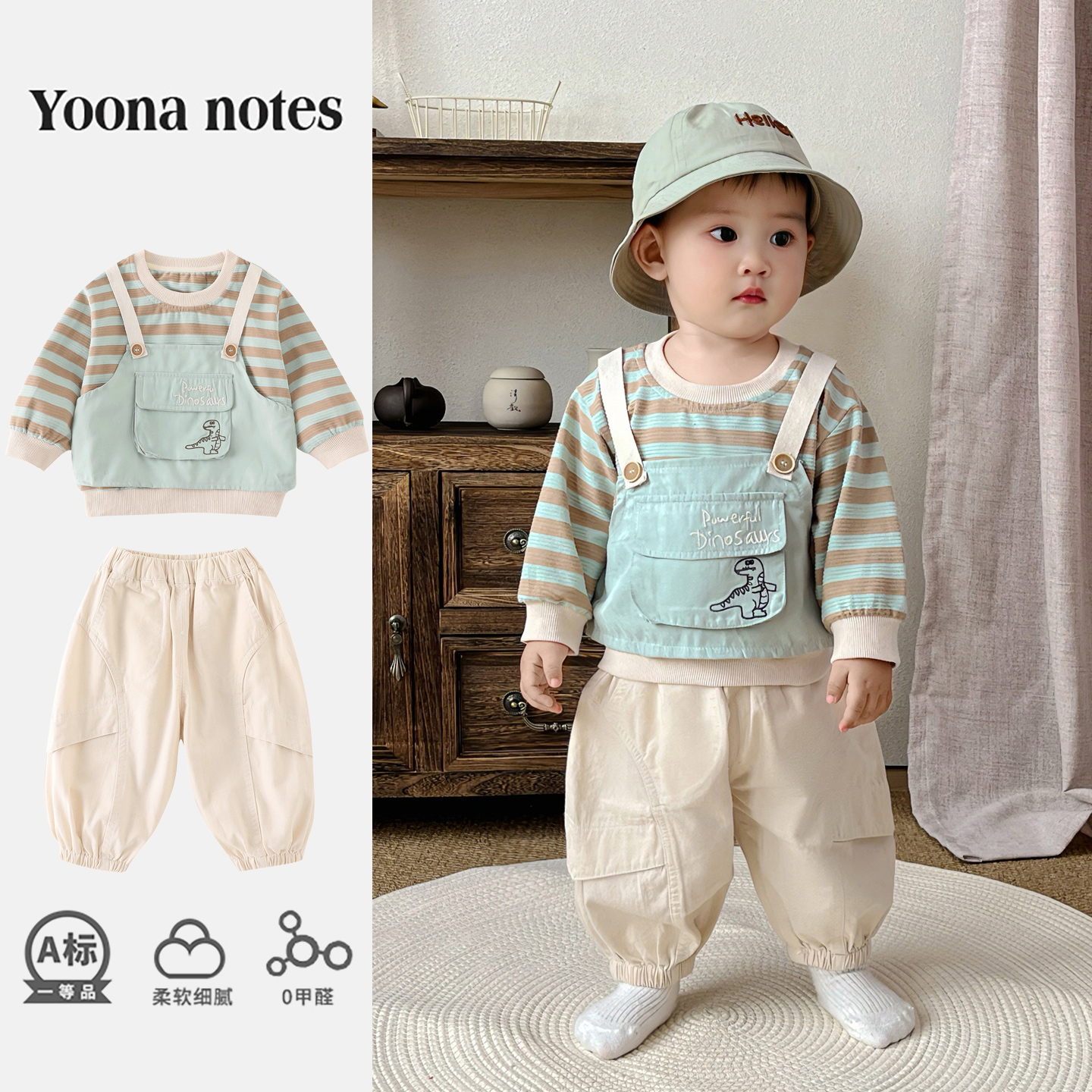 Купить Осенняя детская одежда для маленьких мальчиков, костюм с длинными рукавами, новый стиль, топ, поддельный костюм-двойка с милым рисунком, детский костюм-двойка для прогулок на таобао