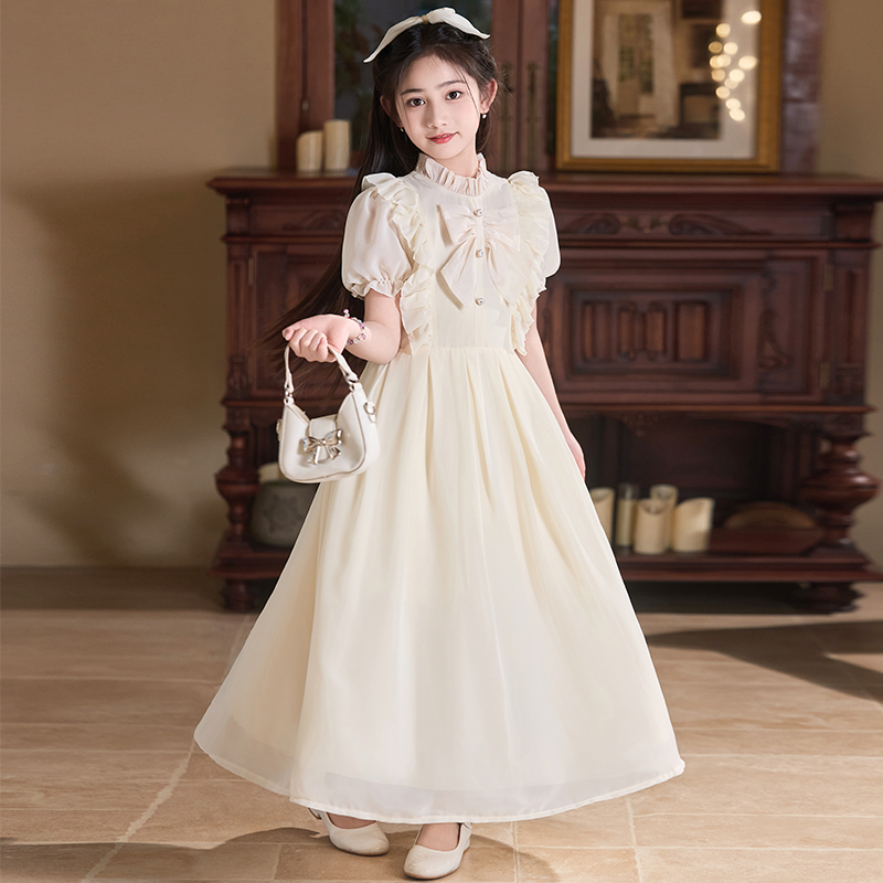 Купить Платья для девочек, летние платья с короткими рукавами, тонкое кружевное платье принцессы с кукольным воротником в западном стиле, большая детская шифоновая юбка, длинная юбка на таобао