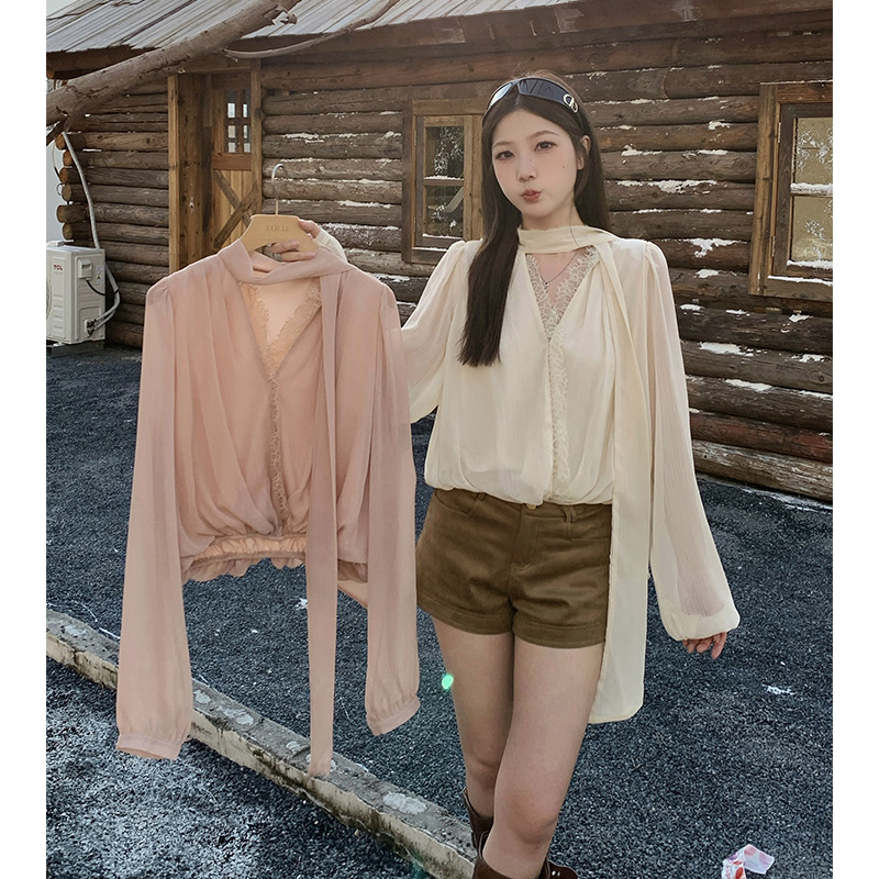 [Тот же стиль в торговом центре] MAXRIENY французская ретро бархатная кружевная рубашка 25 осенняя блузка с v-образным вырезом и длинными рукавами для женщин