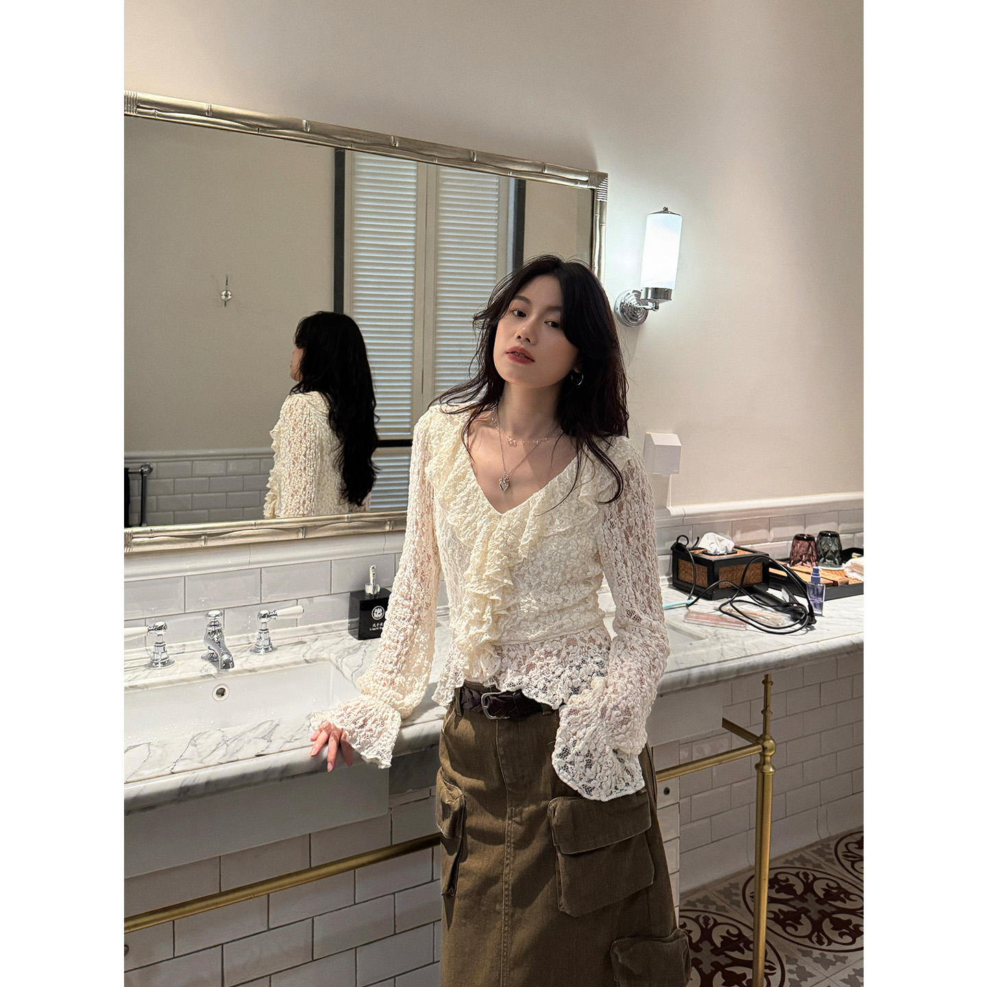 Купить SUSUS, белая кружевная блузка с V-образным вырезом и длинными рукавами, женская осенняя новинка 2025 года, французская полая модная темпераментная блузка на таобао