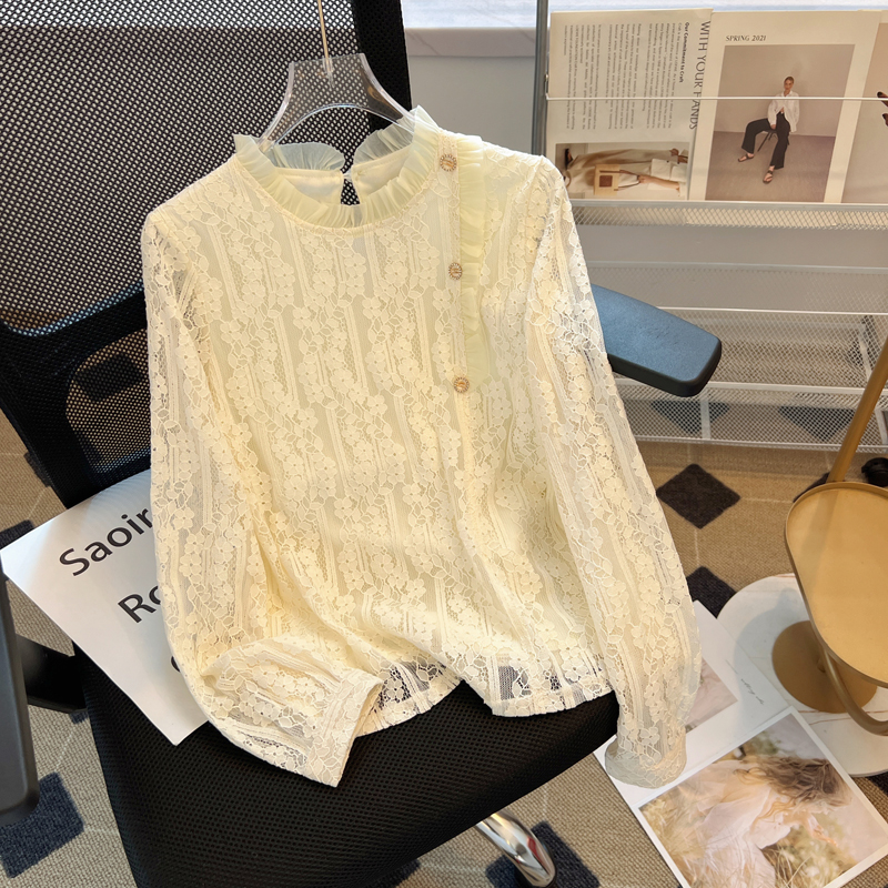 Кружевная нижняя рубашка с полувысоким воротником, женская весенняя, осенне-зимняя тонкая рубашка в западном стиле из тонкой полой внутренней сетки, маленькая рубашка с длинными рукавами