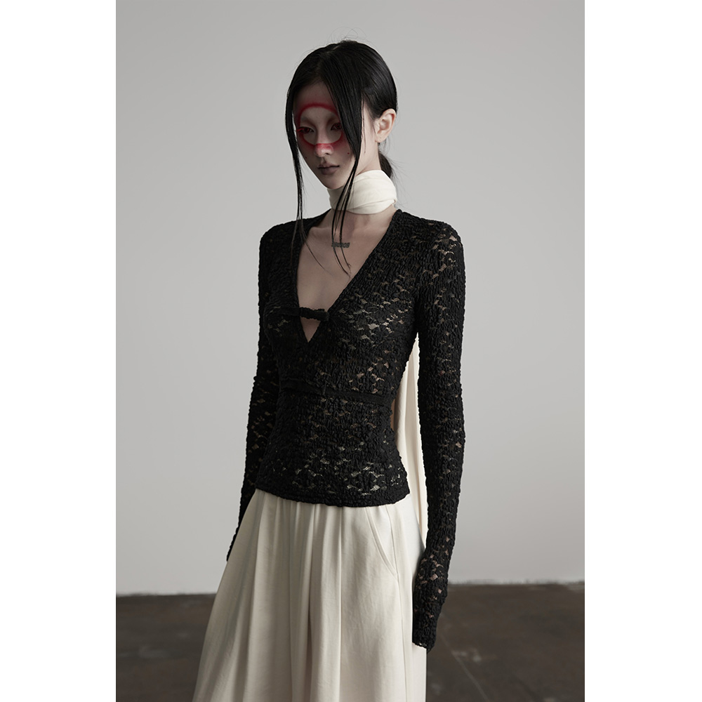 Красивая кружевная рубашка Lin Guan Guan's с v-образным вырезом, женская осенняя уникальная и шикарная нишевая рубашка высокого класса, не допускающая столкновений, приталенный топ с длинными рукавами