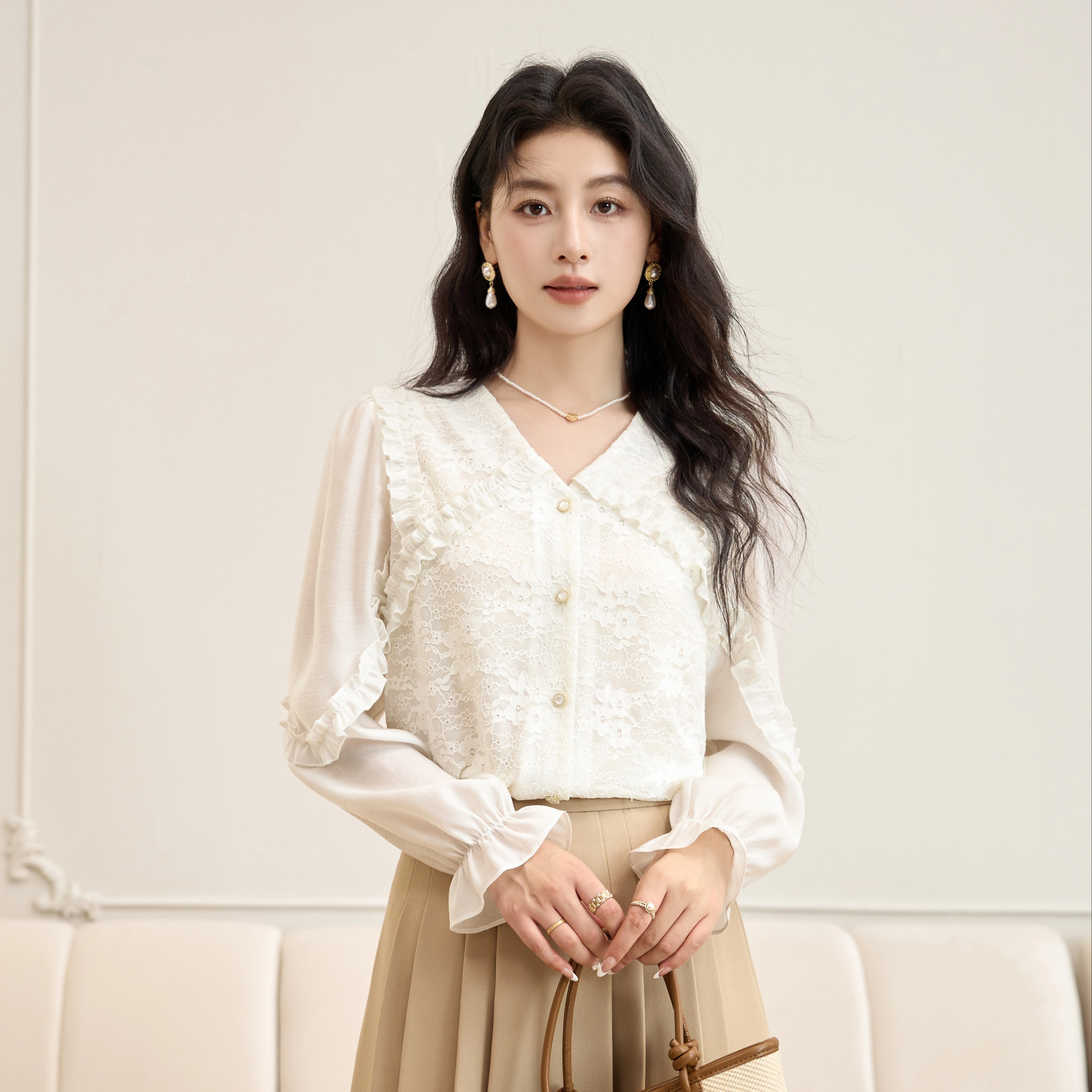 Классическая история, высококачественная изысканная кружевная рубашка, женская осенняя новинка 2025 года, французская рубашка с пышными рукавами и длинными рукавами-крылышками