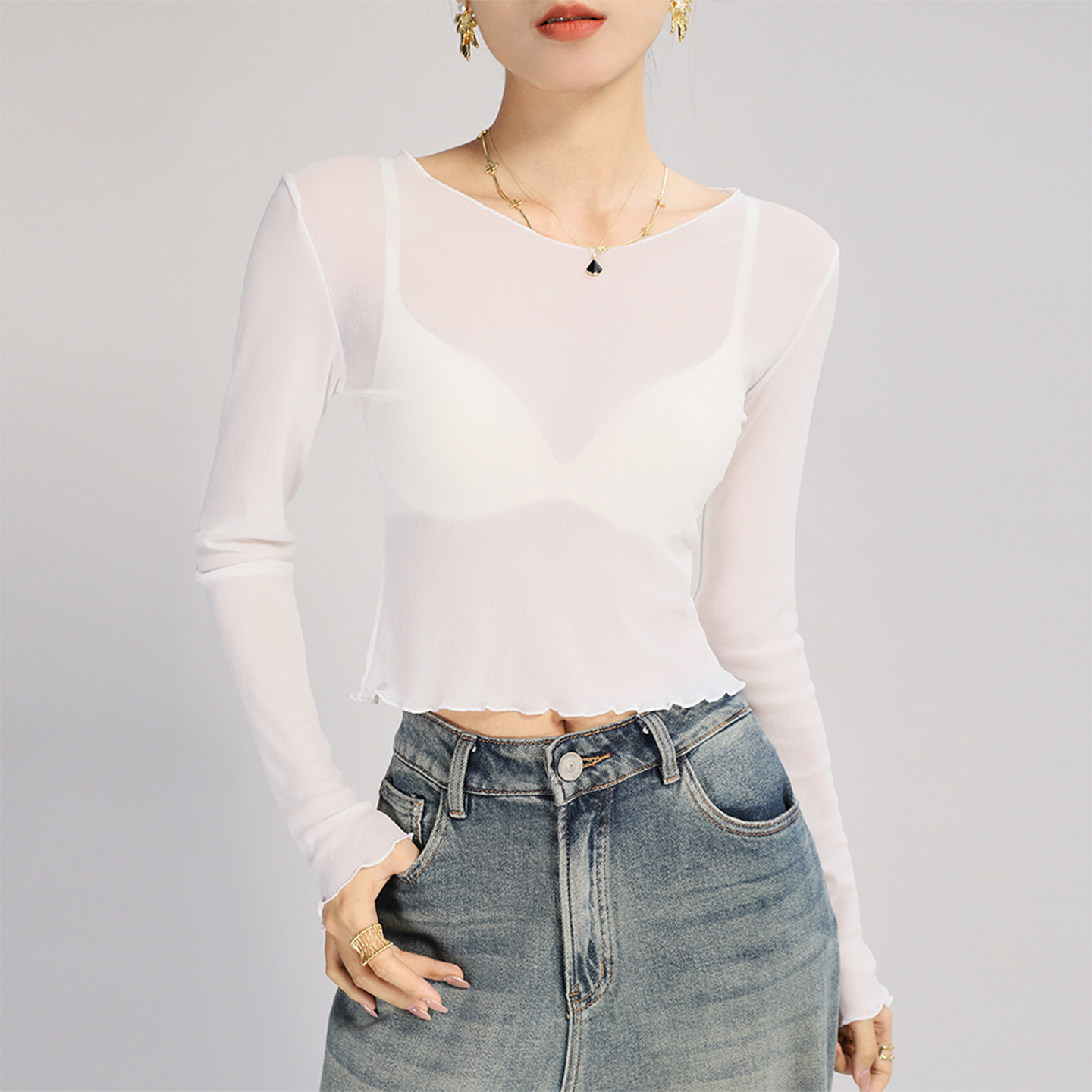 Кружевная нижняя рубашка, уложенная внутрь, белый короткий прозрачный сетчатый топ высокого качества с длинными рукавами, женская легкая роскошь, высококачественная, тонкая