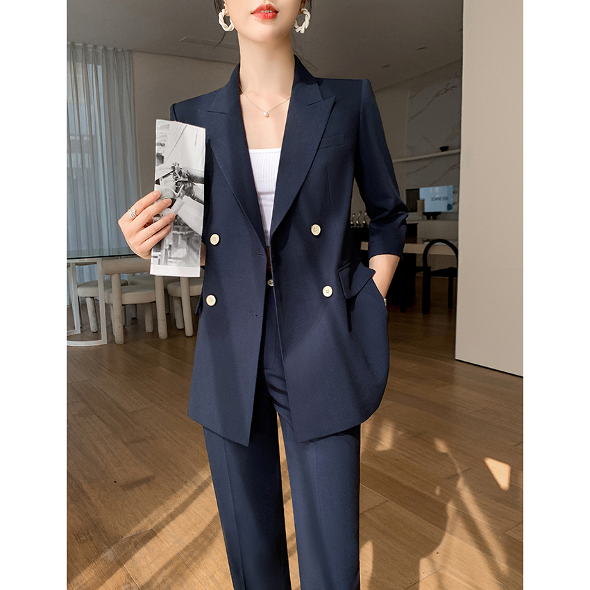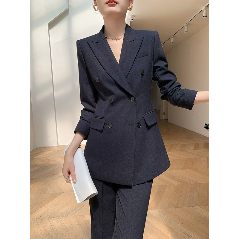 Купить Lelenth, обладающий высоким чувством мудрости, темно-синий костюм с роговой пряжкой на заказ, женская профессиональная официальная одежда, тонкий деловой костюм на таобао