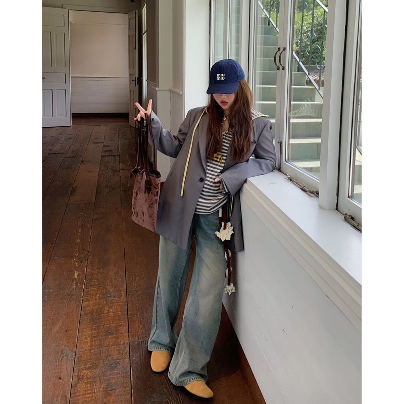 Тот же серый пиджак от Zhang Yuanying - это женский модный стиль осени 2025 года в корейском стиле casual design sense - тонкий и маленький костюм