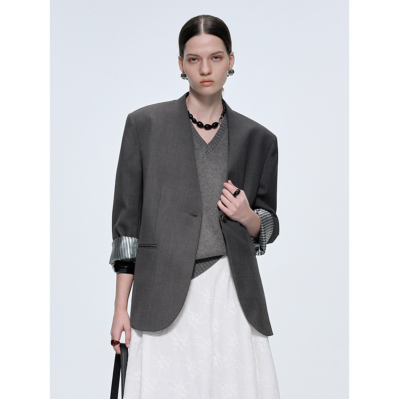 Marryher Maihehe, минималистичный женский весенне-осенний пиджак из шерсти ручной работы, без воротника, с широкими плечами, серого силуэта